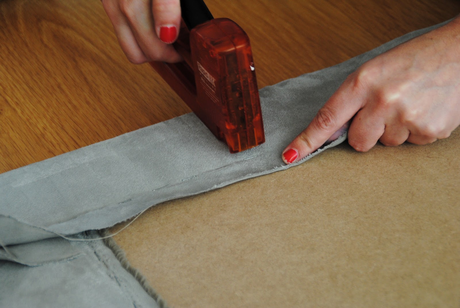 Colocar o tecido, esticando-o muito bem e agrafando atrás da cabeceira.