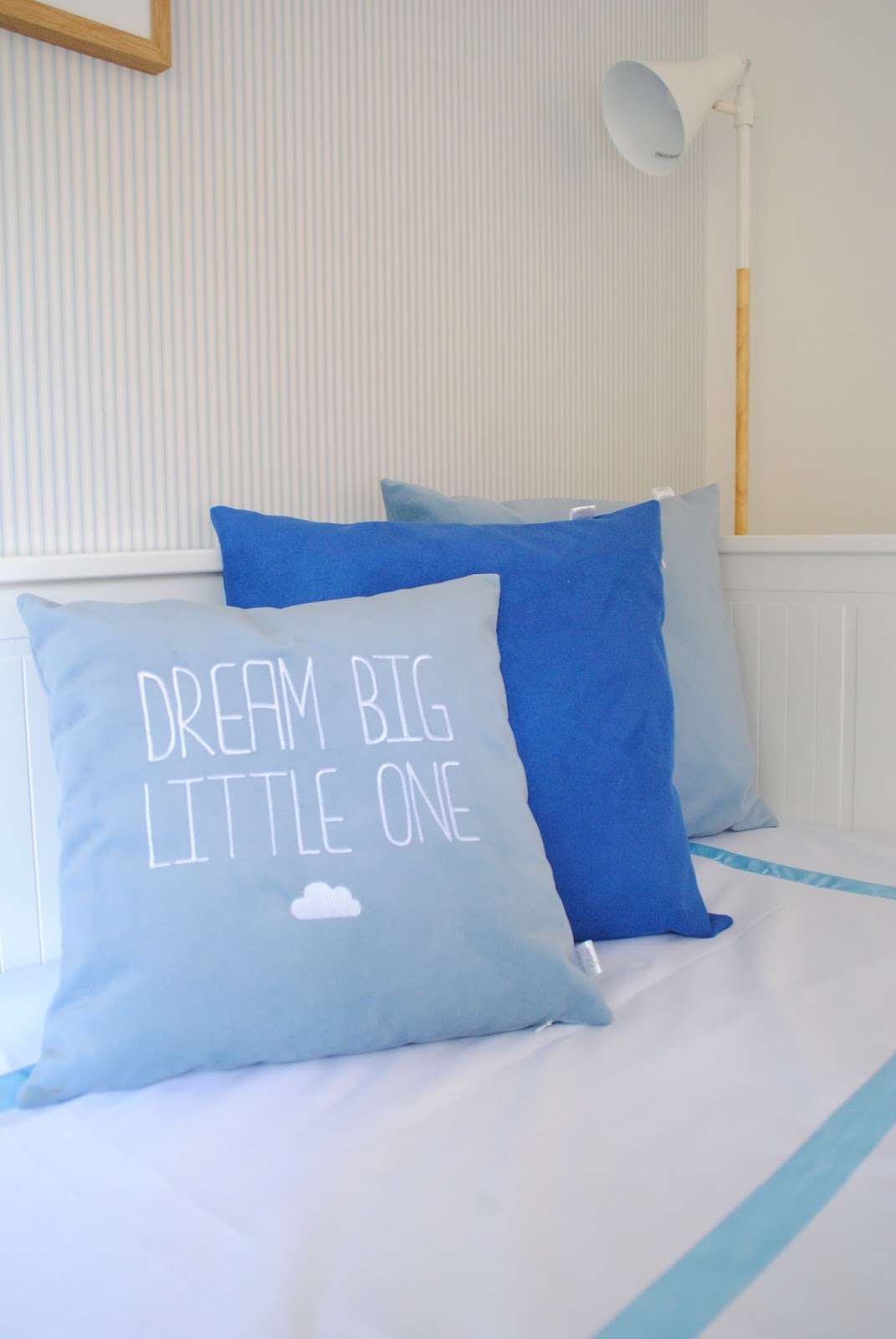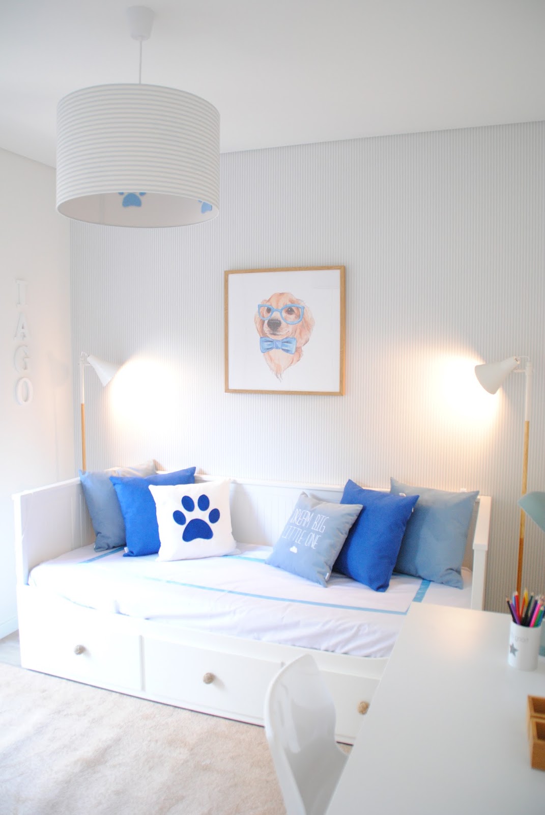 Para terminar esta série de posts sobre este apartamento, hoje é a vez do quarto do filho deste casal. Um menino vivaço e lindo que queria que o tema do quarto fosse o cão! Nenhum cão em particular, todos os caninos em geral :D. Apesar da certeza absoluta deste pequeno cliente, não quis abusar do tema até porque sei que mais dia menos dia, o Iago pode vir a ter outros interesses, as crianças vão passando por várias fases, vivem diferentes entusiasmos e não queria dificultar a vida desta mãe um dia que quisesse alterar o tema do espaço. Afinal, eles crescem rápido! Assim, pontuámos com alguns elementos que podem facilmente ser substituídos como o quadro 'Bow Tie Dog' que para mim é a estrela deste quarto. Adoro o resultado do candeeiro de teto! Comecei por pedir o abatjur com o mesmo papel usado na parede com a risca fininha em azul. Mas depois quase em cima da data de entrega do projeto, peguei na pistola de cola quente e deixei-lhe ali umas pegadas de cão, não estão muito evidentes, mas estão lá!