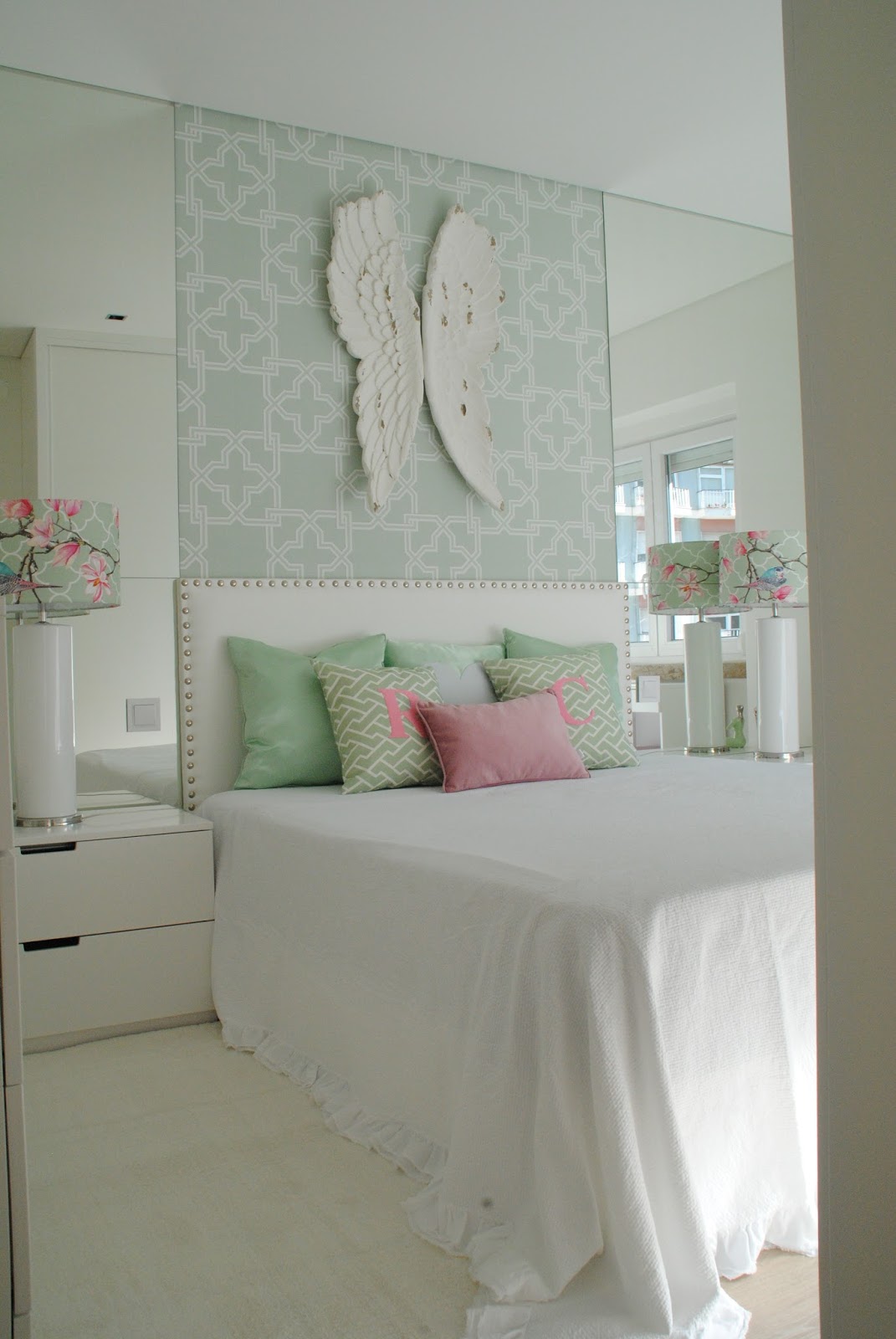 Ahh! E a colcha que fizemos para este quarto tem dupla face. Ou seja, tem esta moldura de um lado e do outro, tem uma risca fina, semelhante ao papel de parede. Pormenores!